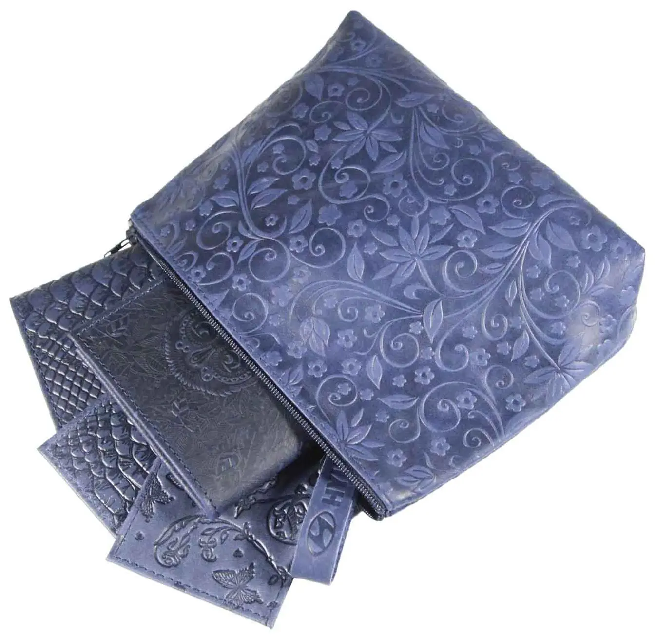 Косметичка из натуральной кожи 21x5x14 см, синяя, тиснение по коже конгрев "Флаверс", объемная
