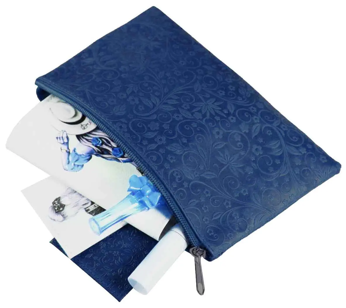 Косметичка из натуральной кожи 21x0,5x12,5 см, синяя, тиснение по коже конгрев "Флаверс"
