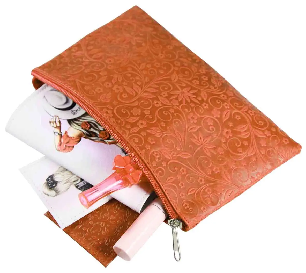 Косметичка из натуральной кожи 21x0,5x12,5 см, рыжая, тиснение по коже конгрев "Флаверс"