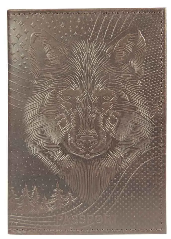 Обложка для паспорта из натуральной кожи, коричневый, сплошное тиснение по коже "Волк"