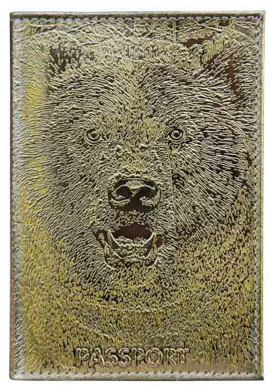 Обложка для паспорта из натуральной кожи, золотой, сплошное тиснение фольгой "металлик" по коже "Медведь 3D"