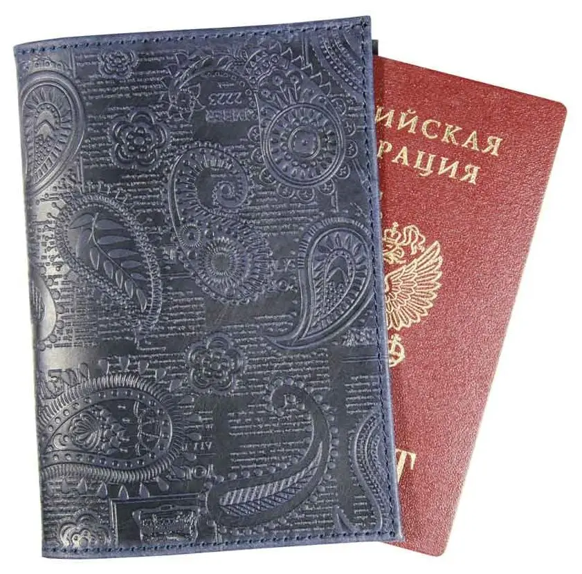 Обложка для паспорта из натуральной кожи, синий, сплошное блинтовое тиснение по коже "Индийский орнамент"