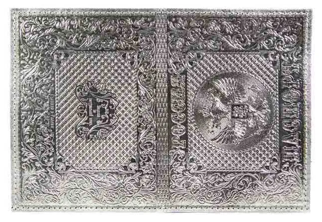 Обложка для паспорта из натуральной кожи, металлик серебрянный, тисн.блинтовое"РОССИЯ-ПАСПОРТ-ГЕРБ"