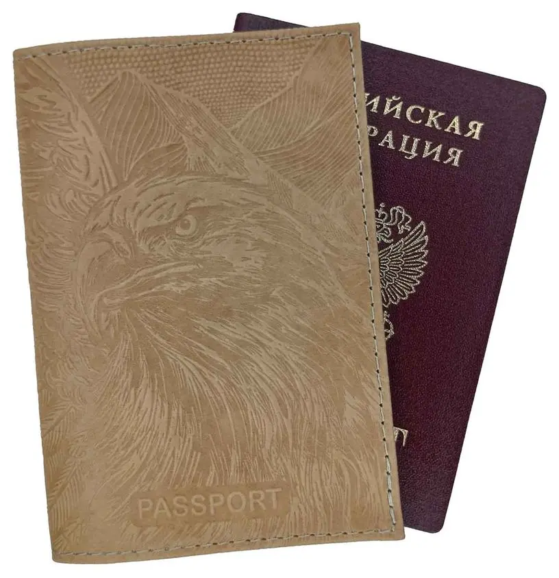 Обложка для паспорта из натуральной кожи, бежевый, сплошное тиснение по коже "Орел"