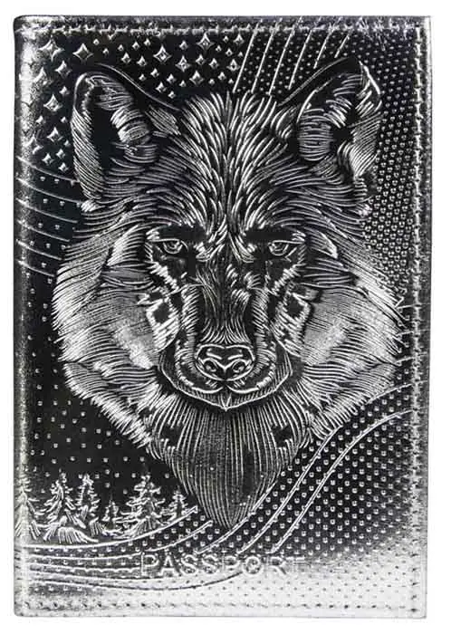 Обложка для паспорта из натуральной кожи, серебряный, сплошное тиснение фольгой по коже "Волк Металлик"