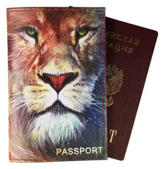 Обложка для паспорта из натуральной кожи, цветной рисунок по коже "Лев"