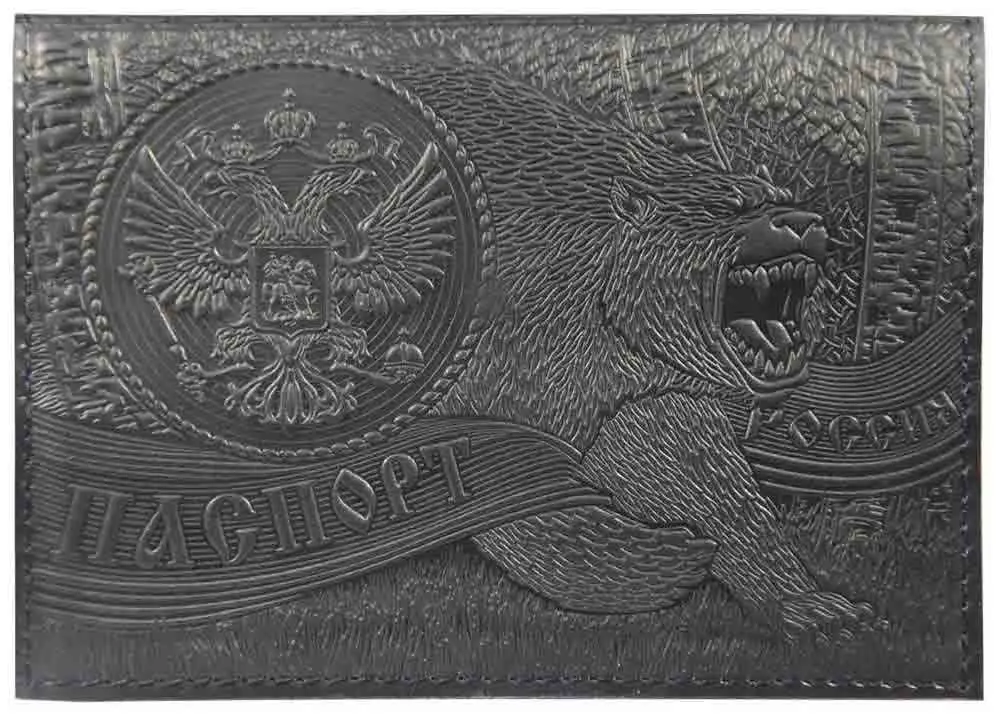 Обложка для паспорта из натуральной кожи, черный, тисн.блинтовое"Медведь"