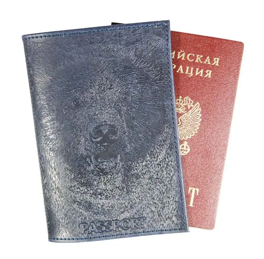 Обложка для паспорта из натуральной кожи, синий, сплошное блинтовое тиснение по коже "Медведь 3D"