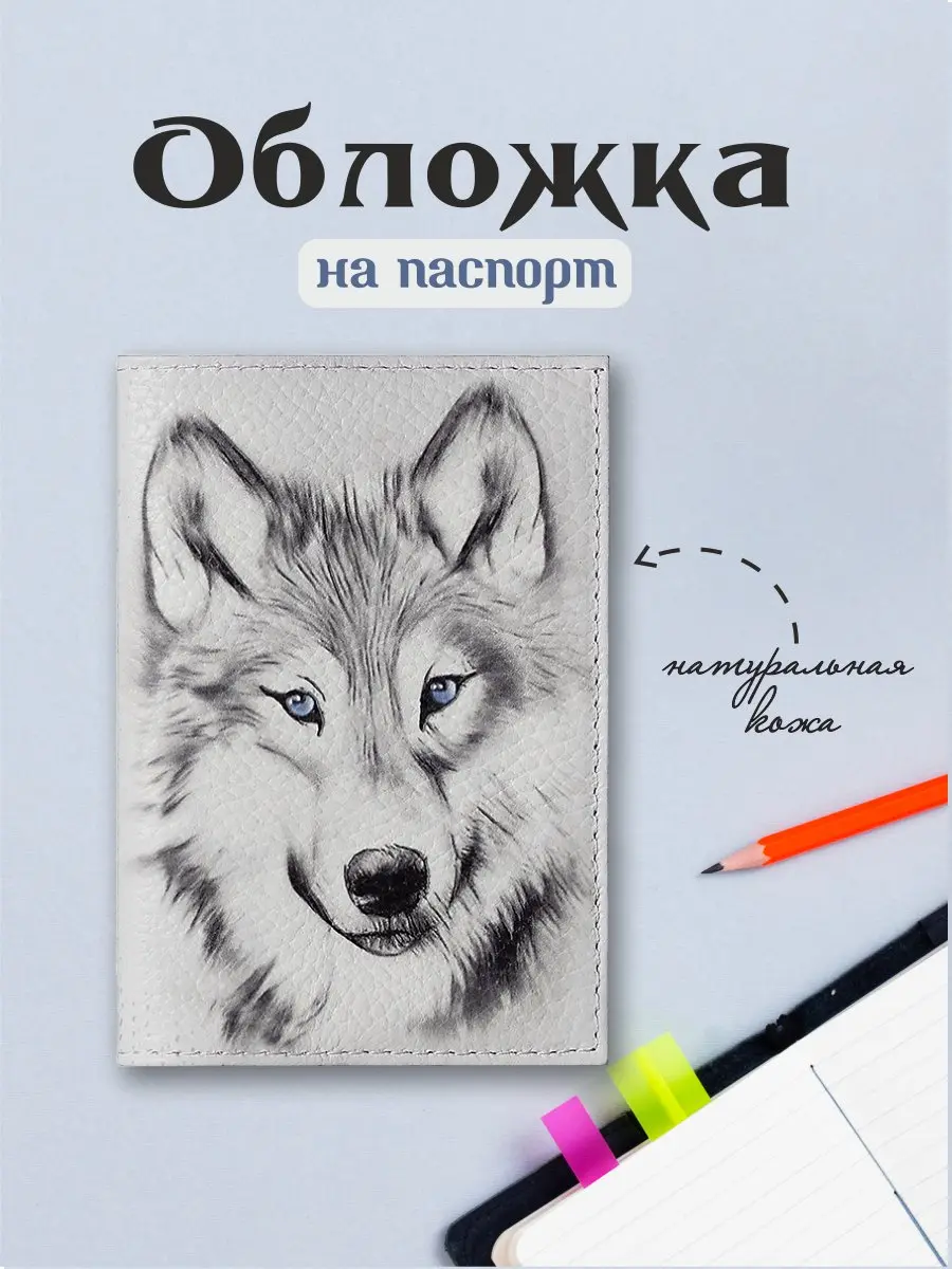 Обложка для паспорта из натуральной кожи, цветной рисунок по коже "Северный волк"