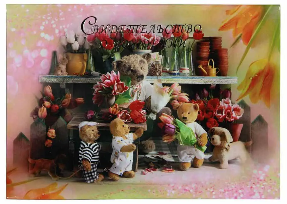 Папка с файлом ламинированная А5 (пухлая) "Свидетельство о рождении" Мишки с цветами