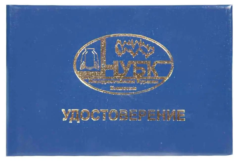 Удостоверение жесткое, 95*65 мм, бумвинил синий, тиснение золото "НУБК", без вклейки