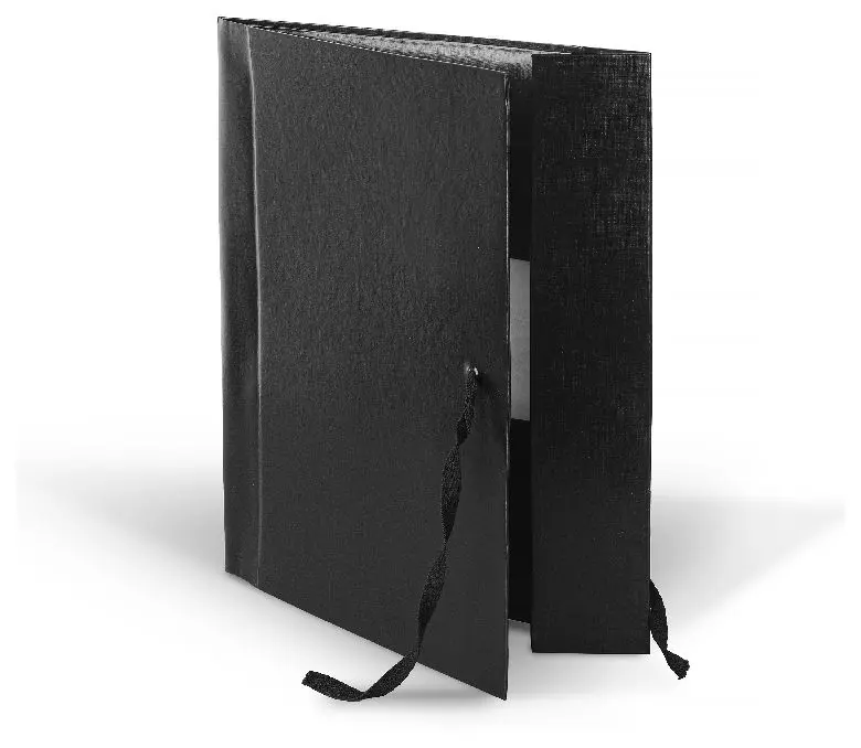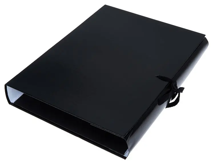 Архивная папка жесткая. Выполнена из плотного переплетного картона, обклеенного бумвинилом черного цвета, с корешками 50 мм и тремя клапанами. Сторонки папки выклеены белой бумагой. Папка вмещает до 500 листов формата А4. Папка завязывается на 2 шнурка.