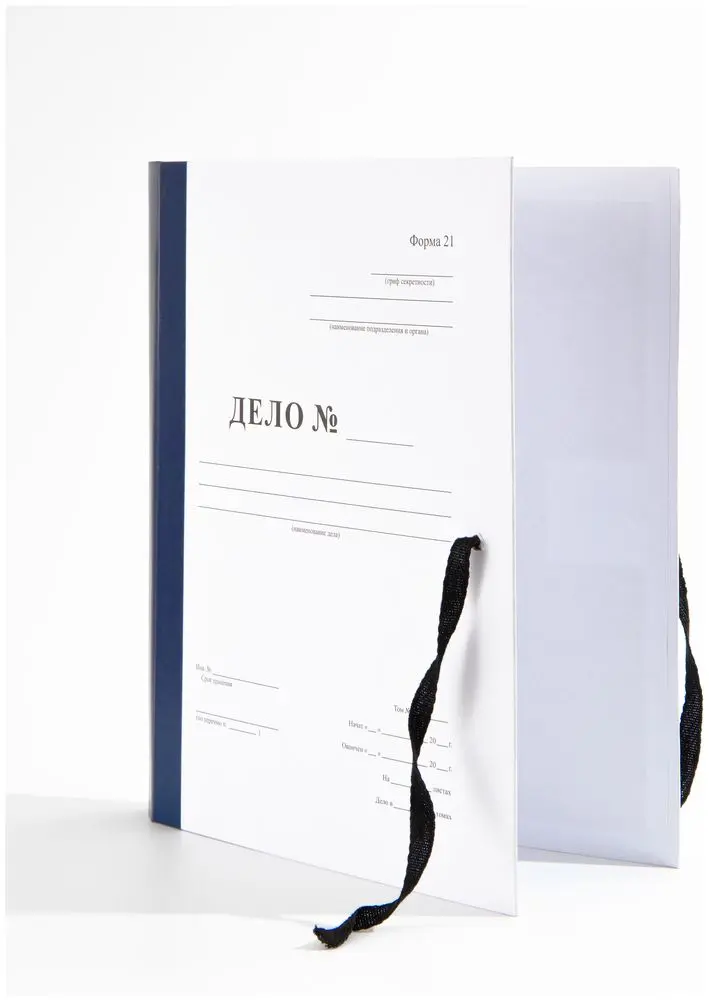 Архивная папка «ДЕЛО №…» (форма 21) формата А4 выполнена из плотного картона, обклеенного офсетной бумагой. Корешок мягкий, шириной 70 мм, выполнен из синего бумвинила. Внутренние гребешки с 4 отверстиями из плотного картона и бумвинила того же цвета позволяют подшивать документы с помощью шнура до 650 листов. В закрытом виде папка фиксируется двумя завязками.
