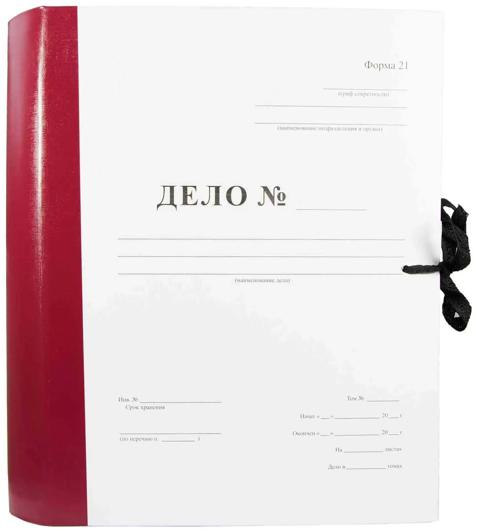 Архивная папка «ДЕЛО №…» (форма 21) формата А4 выполнена из плотного картона, обклеенного офсетной бумагой. Корешок мягкий, шириной 80 мм, выполнен из бордового бумвинила. Внутренние гребешки с 4 отверстиями из плотного картона и бумвинила того же цвета позволяют подшивать документы с помощью шнура до 750 листов. В закрытом виде папка фиксируется двумя завязками.