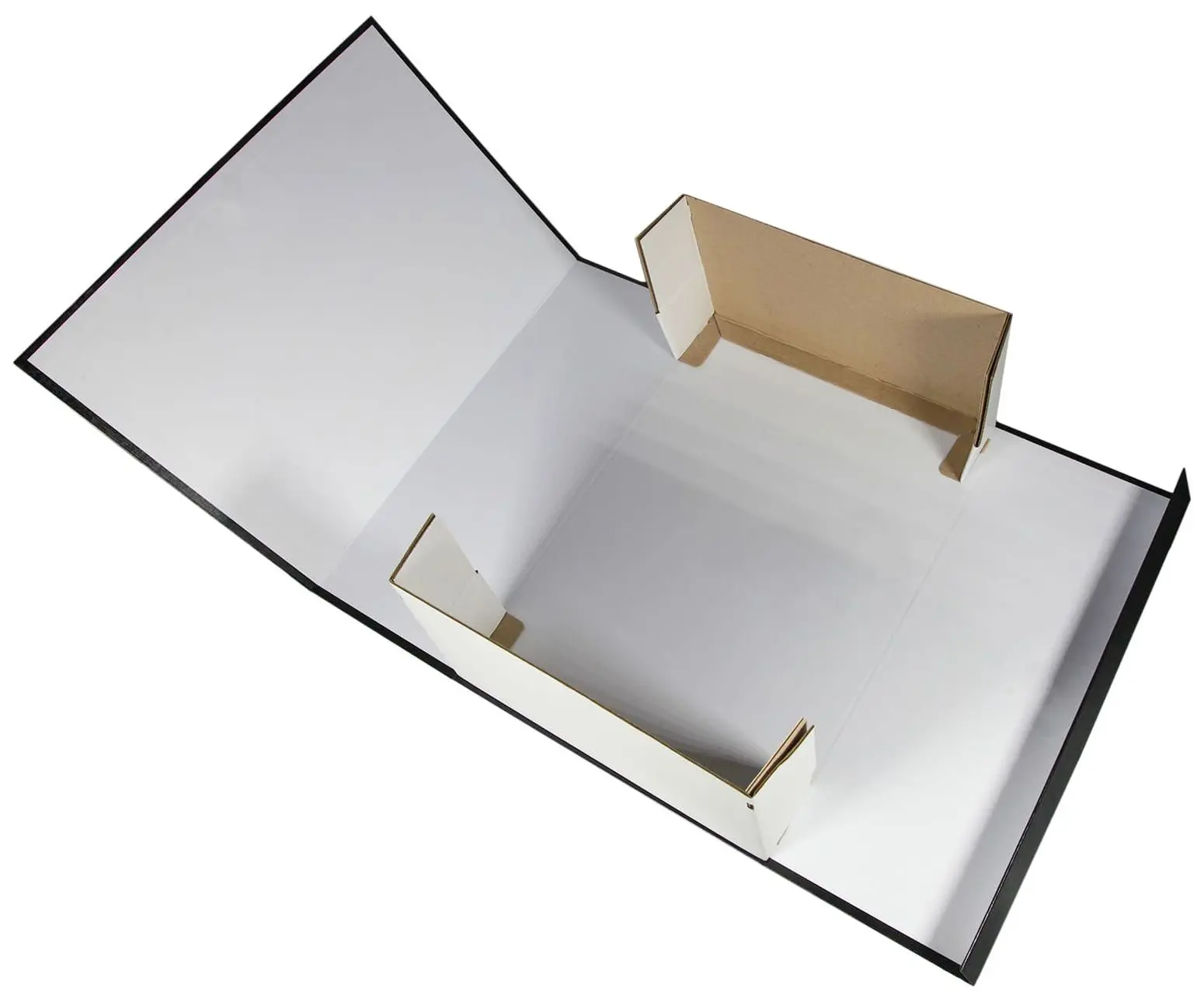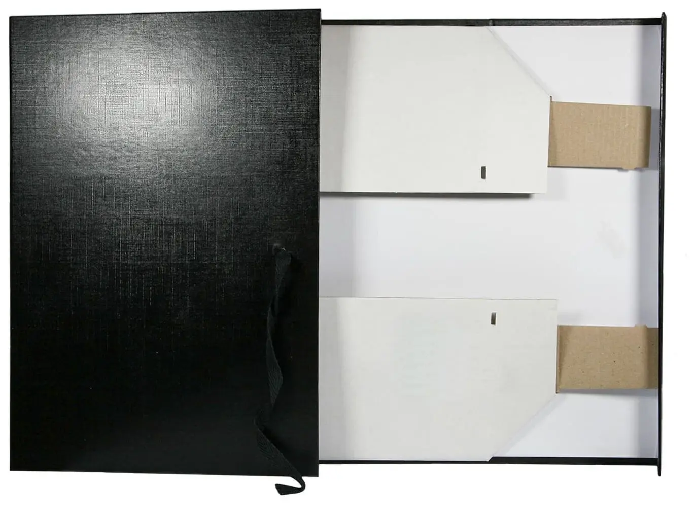 Архивный короб формат А4. Изготовлен из плотного переплетного картона, с внешней стороны покрыт бумвинилом черного цвета. С внутренней стороны белая бумага, имеются стойки-упоры разборные из гофрокартона. В закрытом виде фиксируется с помощью двух завязок. Короб вмещает до 1200 листов формата А4. Размер изделия в собранном виде - 225х125х320 мм. Упаковка в гофрокороб по 25 шт. Вес упаковки 8,4 кг. Размер упаковки 510х345х205 мм. Поставляются в разобранном виде.