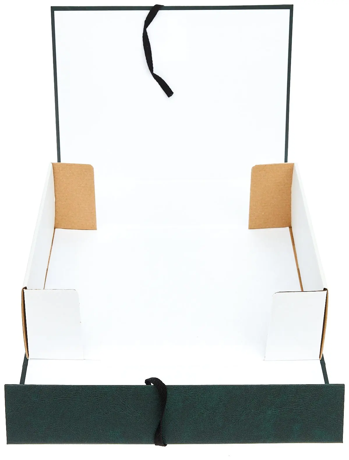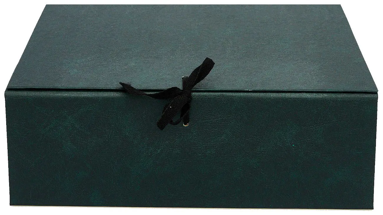покрыт бумвинилом темно-зеленого цвета. Внутри короб обклеен офсетной бумагой, также имеются стойки-упоры, выполненные из гофрокартона. В закрытом виде фиксируется