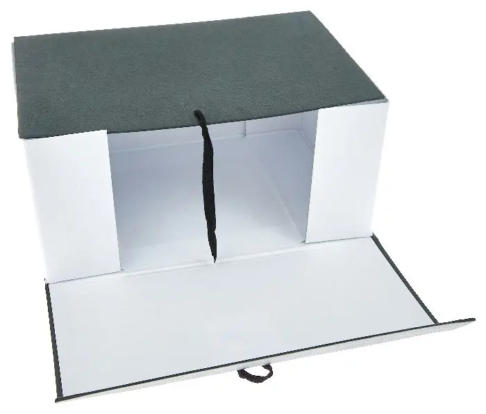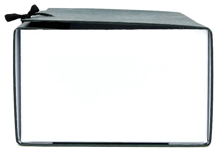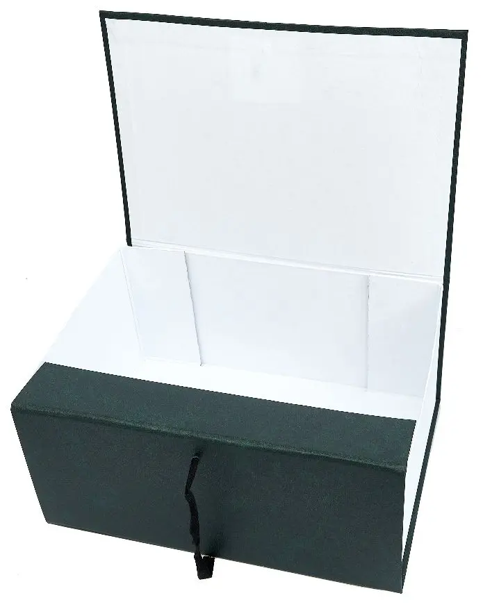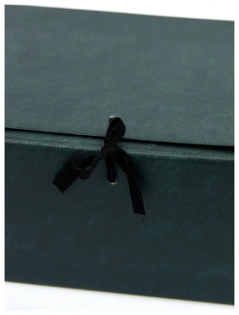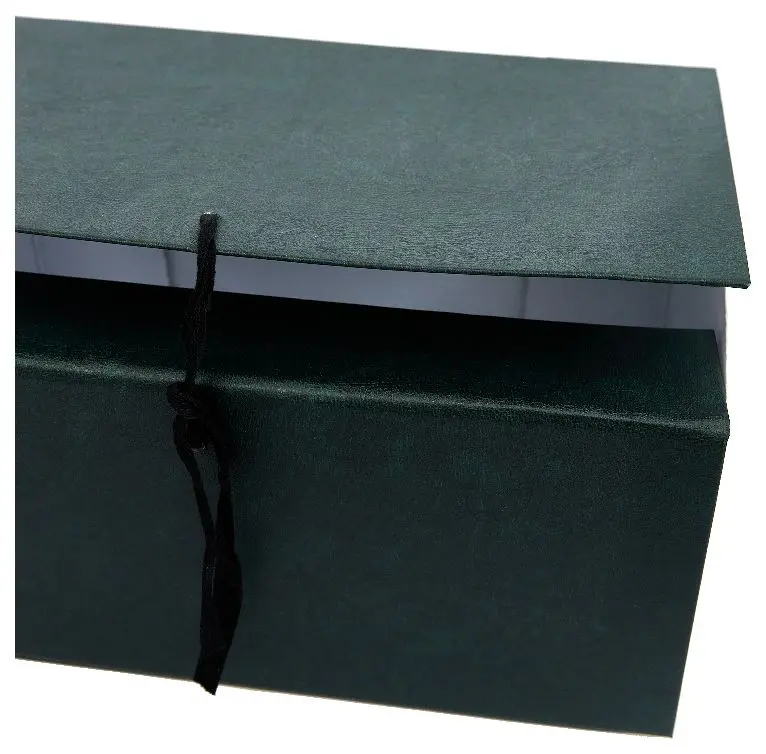 Архивный короб формата А4. Изготовлен из плотного переплетного картона, с внешней стороны покрыт бумвинилом темно-зеленого цвета. Внутри короб обклеен офсетной бумагой, также имеются стойки-упоры, выполненные из плотного картона. В закрытом виде фиксируется с помощью двух хлопчатобумажных завязок.