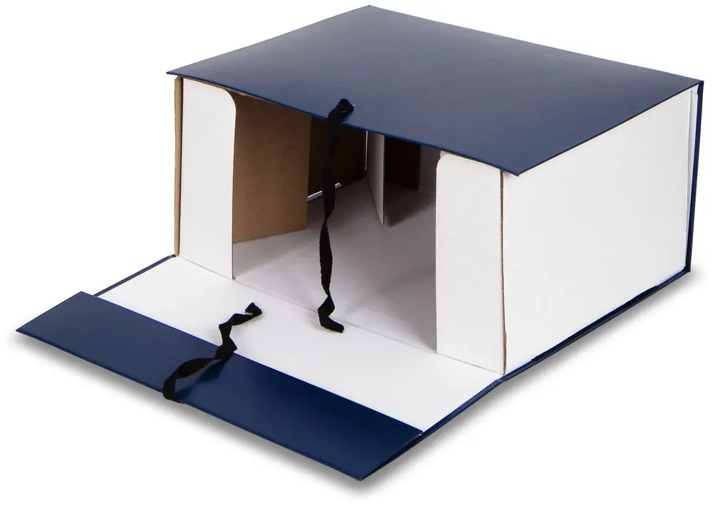 Архивный короб формата А4. Изготовлен из плотного переплетного картона, с внешней стороны