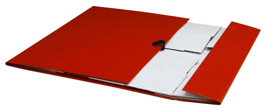 покрыт бумвинилом красного цвета. Внутри короб обклеен офсетной бумагой, также имеются стойки-упоры, выполненные из гофрокартона. В закрытом виде фиксируется
