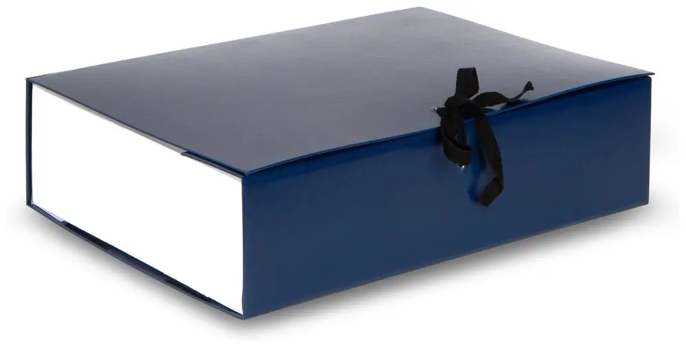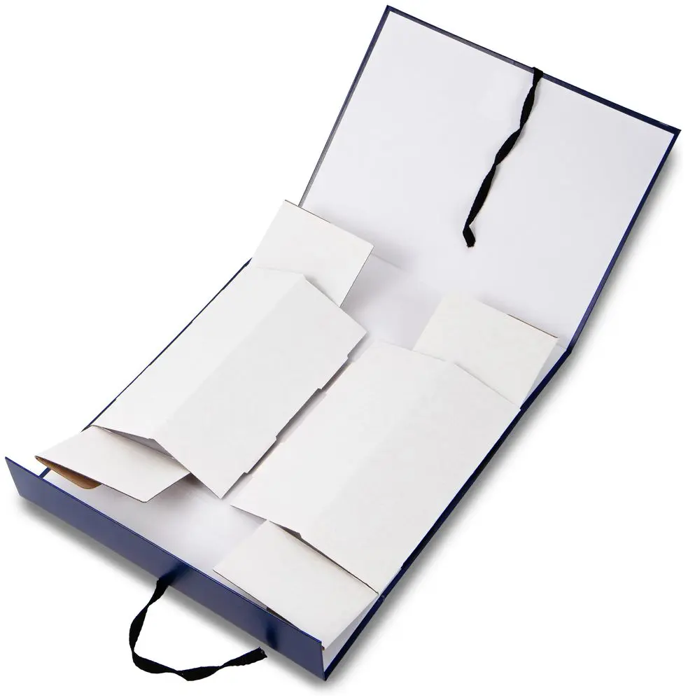 покрыт бумвинилом синего цвета. Внутри короб обклеен офсетной бумагой, также имеются стойки-упоры, выполненные из гофрокартона. В закрытом виде фиксируется