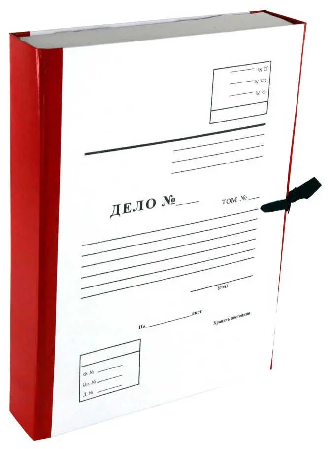 Архивный короб формата А4. Изготовлен из плотного переплетного картона, с внешней стороны покрыт бумвинилом красного цвета. Внутри короб обклеен офсетной бумагой, также имеются стойки-упоры, выполненные из гофрокартона. В закрытом виде фиксируется с помощью двух хлопчатобумажных завязок.