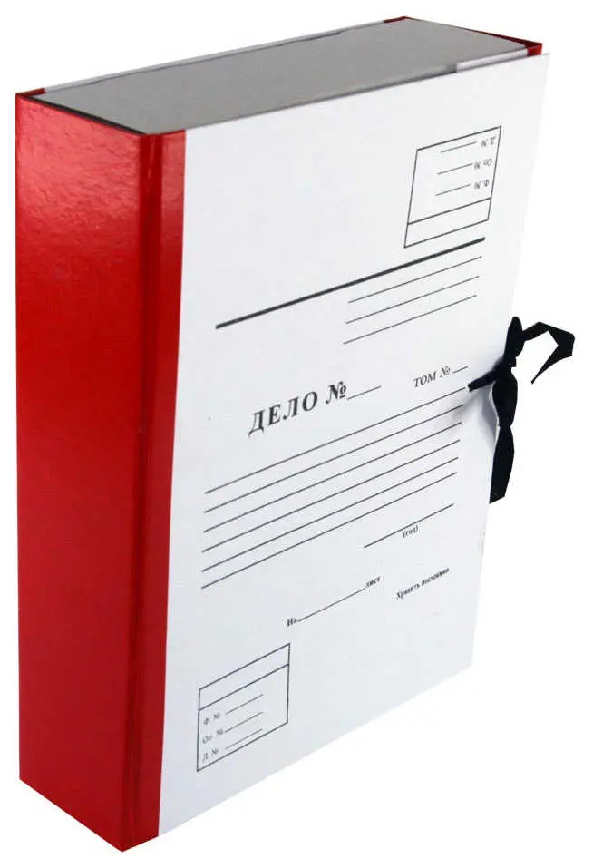 Архивный короб формата А4. Изготовлен из плотного переплетного картона, с внешней стороны покрыт бумвинилом красного цвета. Внутри короб обклеен офсетной бумагой, также имеются стойки-упоры, выполненные из гофрокартона. В закрытом виде фиксируется с помощью двух хлопчатобумажных завязок.