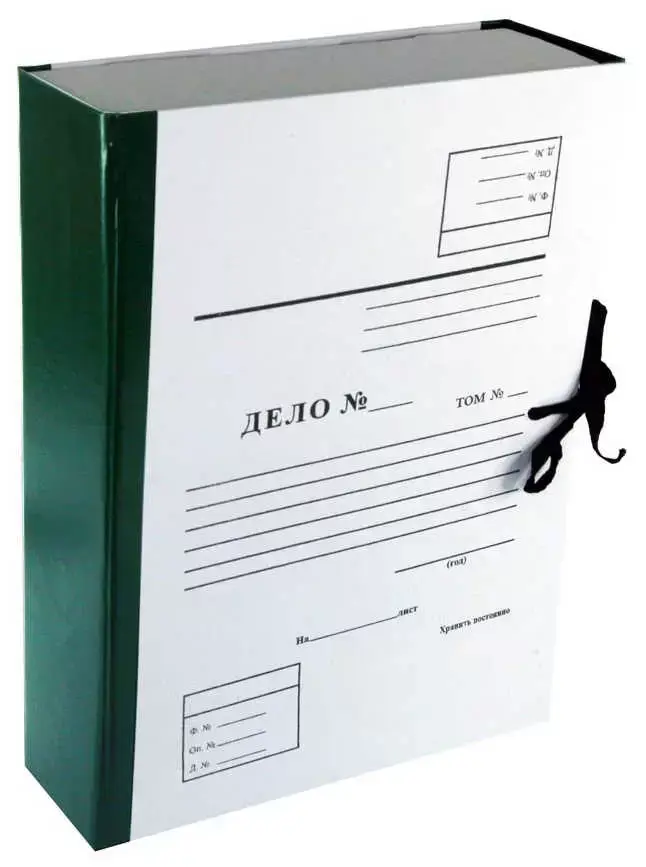 Архивный короб формата А4. Изготовлен из плотного переплетного картона, с внешней стороны покрыт бумвинилом зеленого цвета. Внутри короб обклеен офсетной бумагой, также имеются стойки-упоры, выполненные из гофрокартона. В закрытом виде фиксируется с помощью двух хлопчатобумажных завязок.