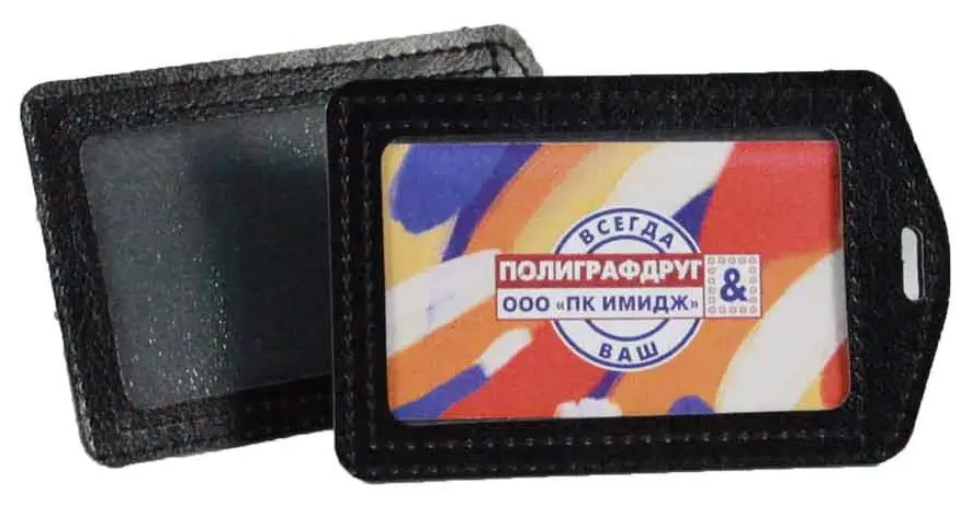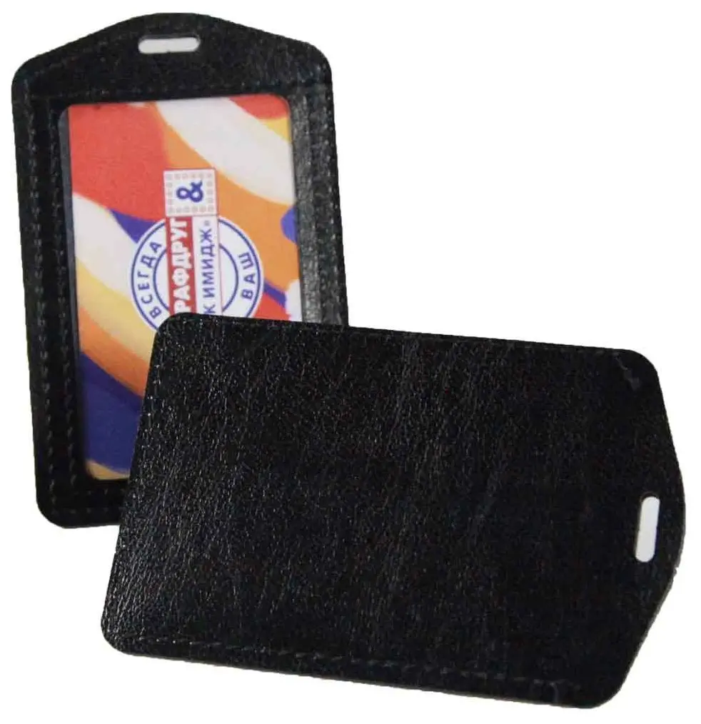 Бейджи из искусственной кожи, прошитые по краям, с окошечком из толстой прозрачной пленки ПВХ. Сделаны под размер визитной карточки или размер банковской карточки. Бейджи имеют ушко для крепления ретрактора или другого держателя. Держатель можно заказать отдельно (артикул ДР-В) Цвет черный