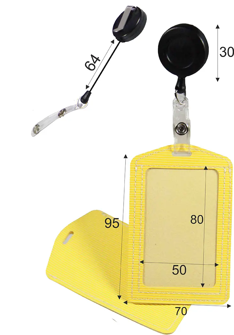 Бейджи из галантерейной пленки PU, прошитые по краям, с окошечком из толстой прозрачной пленки ПВХ. Сделаны под размер визитной карточки или размер банковской карточки. Бейджи имеют ушко для крепления ретрактора или другого держателя. Поставляются в комплекте с качественными ретракторами. Ретракторы в комплекте улучшенного качества, проверены на долгосрочную эксплуатацию, внутреннее крепление втягивающей пружины усиленное и не ломается. Благодаря ретрактору нет необходимости откреплять бейдж, достаточно потянуть шнурок ретрактора, который потом втягивается автоматически. Цвет желтый