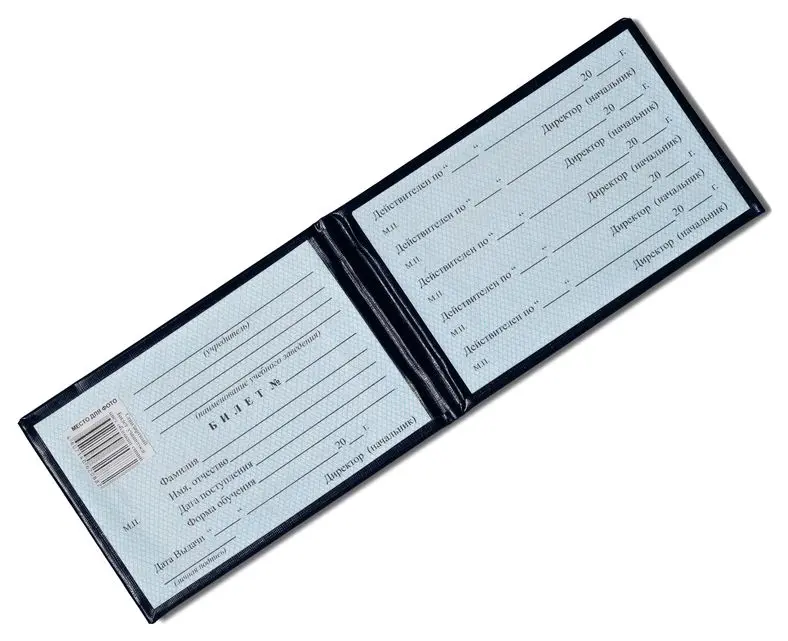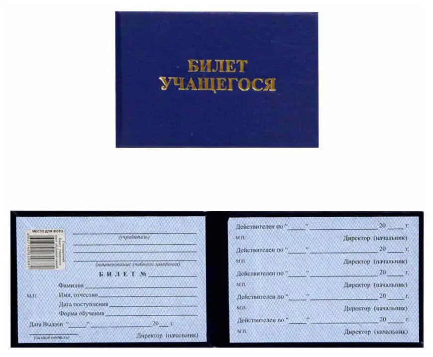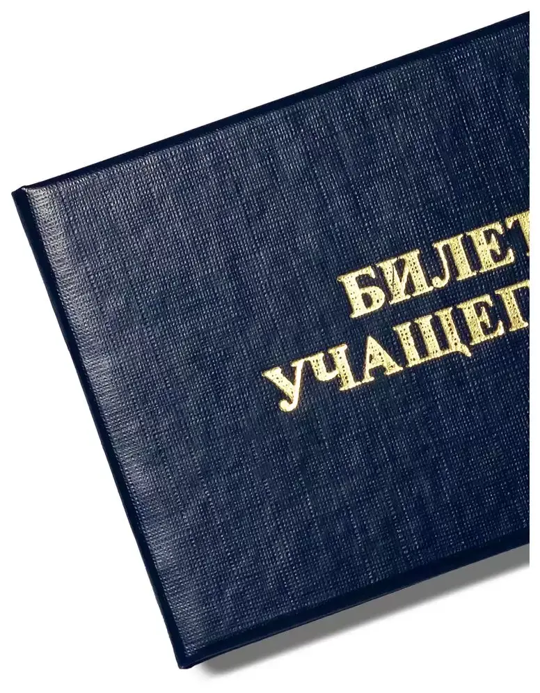 Билет учащегося в жесткой обложке 95*65 мм. Переплет изготовлен из синего бумвинила, надпись "БИЛЕТ УЧАЩЕГОСЯ" выполнена золотым тиснением. Внутри удостоверение имеет бумажную вклейку для заполнения.