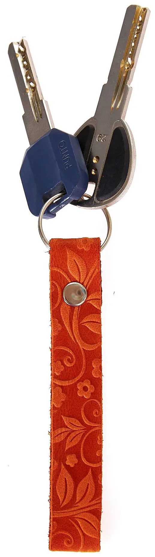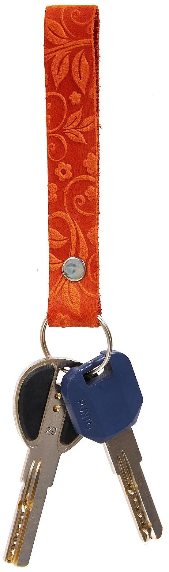 Натуральная кожа очень прочная, приятная на ощупь. Долговечная, не трескается, не рвётся. За петельку удобно носить и подвешивать. Удобно крутить на пальце.