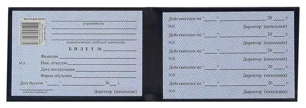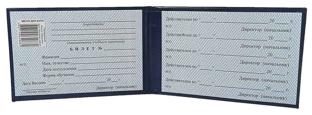 Читательский билет в жесткой обложке 95*65 мм. Переплет изготовлен из синего бумвинила, надпись "ЧИТАТЕЛЬСКИЙ БИЛЕТ" выполнена золотым тиснением. Внутри удостоверение имеет бумажную вклейку для заполнения.