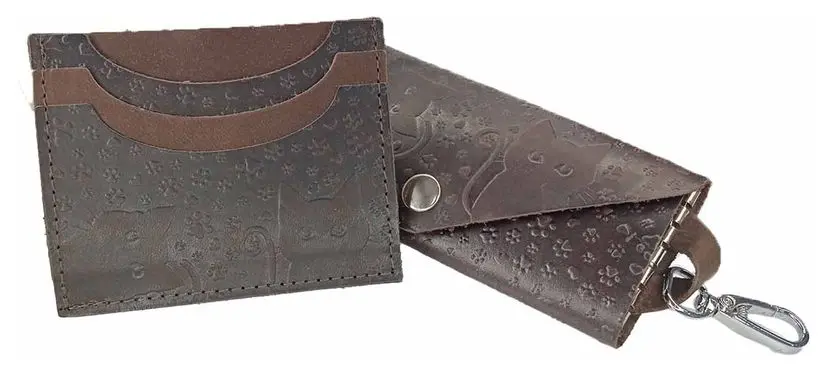 Картхолдер "Улыбка" из натуральной кожи, коричневый, тиснение "Котики"