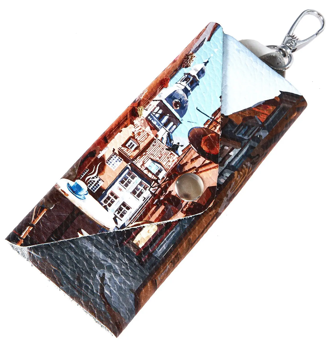 Ключница из натуральной кожи на кнопке, цветной рисунок по коже "Домский собор"