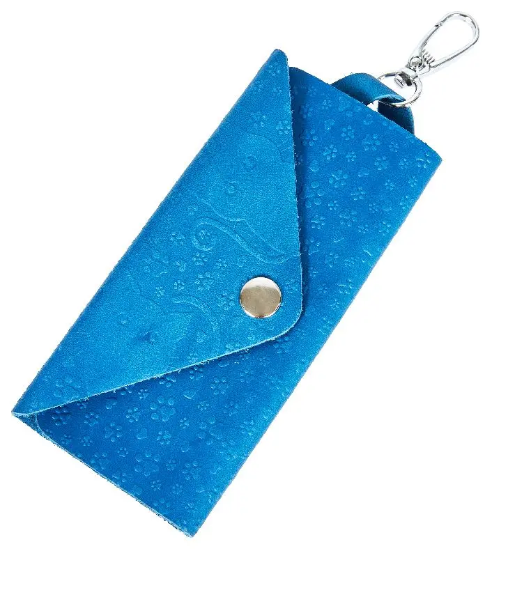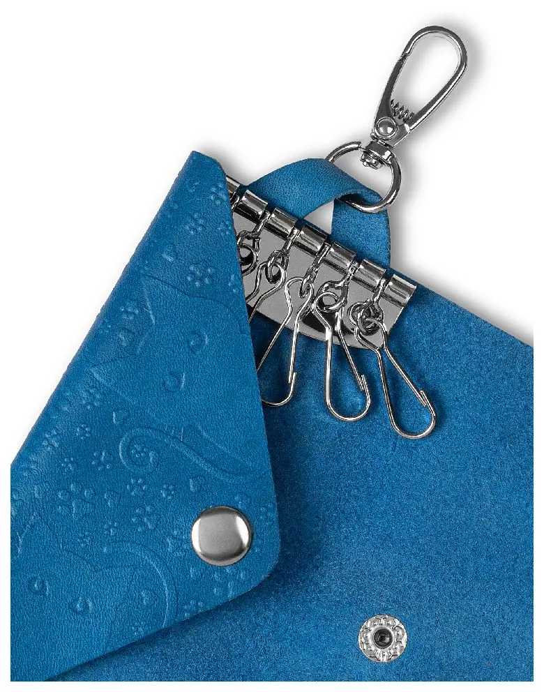 Ключница из натуральной кожи на кнопке, голубая, тиснение "Котики"