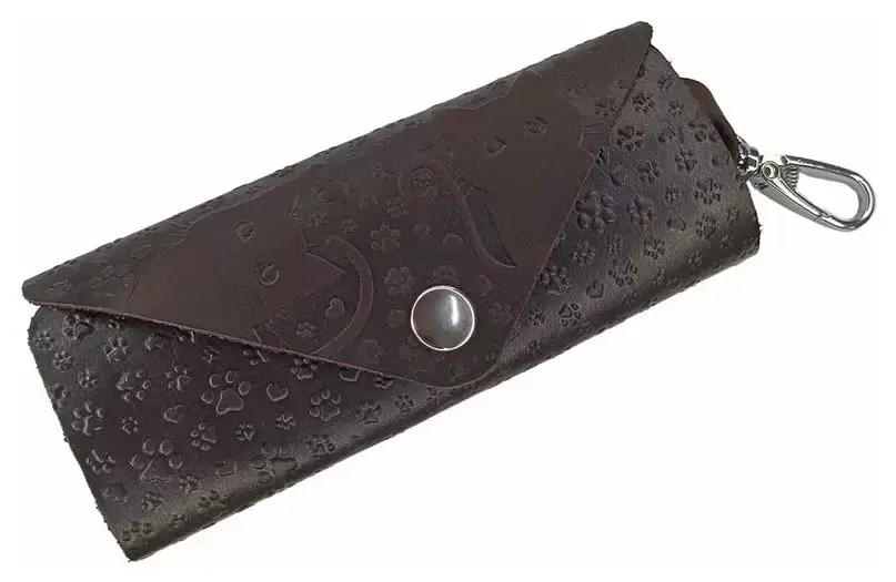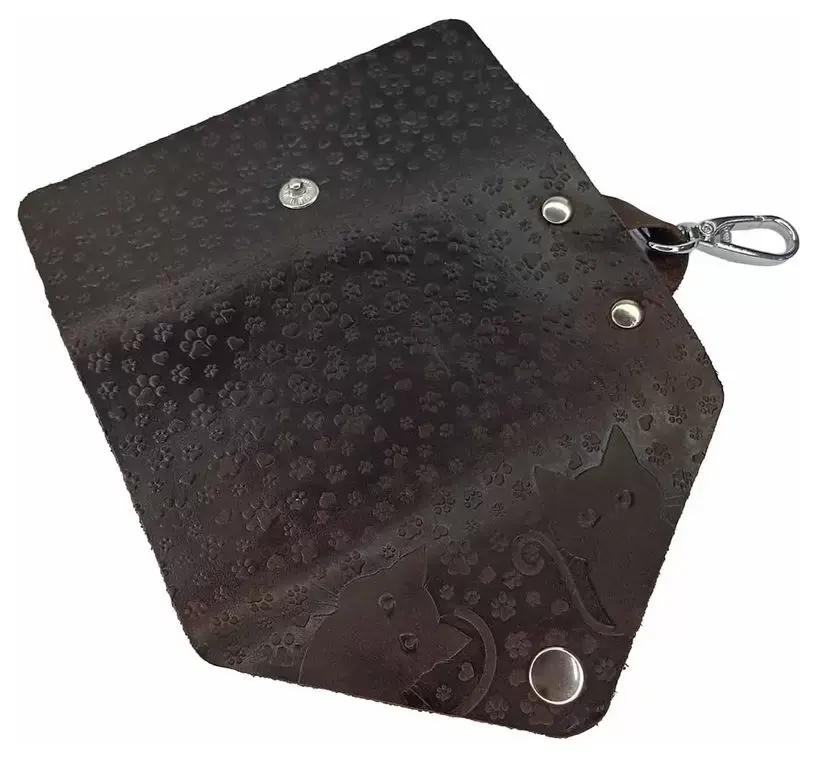 Ключница из натуральной кожи на кнопке, коричневая, тиснение "Котики"