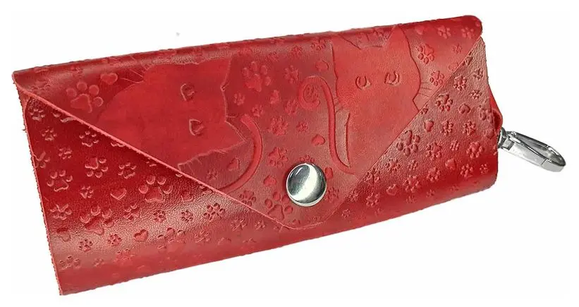 Ключница из натуральной кожи на кнопке, красная, тиснение "Котики"