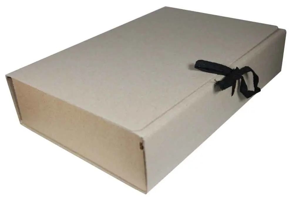 Складной короб "Отчет-архив" изготовлен из переплетного картона. Внутренние стойки выполнены из микрогофрокартона. В закрытом виде фиксируется с помощью двух хлопчатобумажных завязок. Ширина корешка - 70 мм. Внешние размеры 220х70х320 мм.