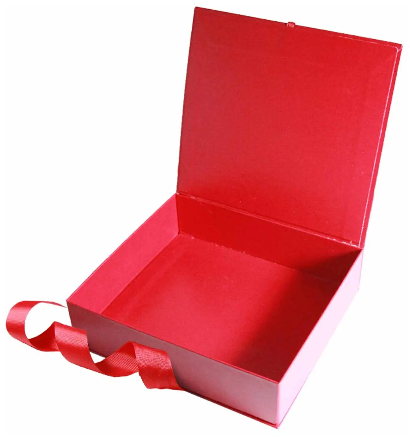 Коробка для подарков представительского уровня. Качественная и красивая. Выполнена из переплетного картона, кашированного бумвинилом красного цвета и дополнена атласной лентой в цвет коробки. Размер коробки 200*180*50 мм
