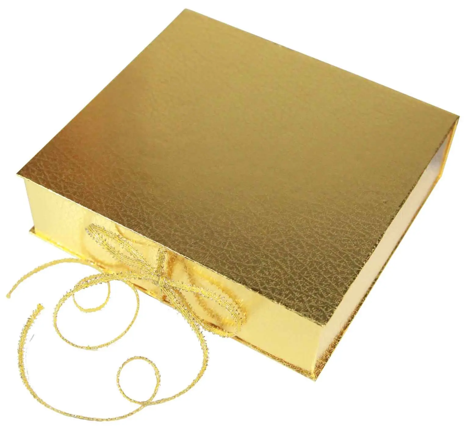Коробка для подарков представительского уровня. Качественная и красивая. Выполнена из переплетного картона, кашированного переплетной бумагой золотого цвета и дополнена лентой в цвет коробки. Размер коробки 200*180*50 мм