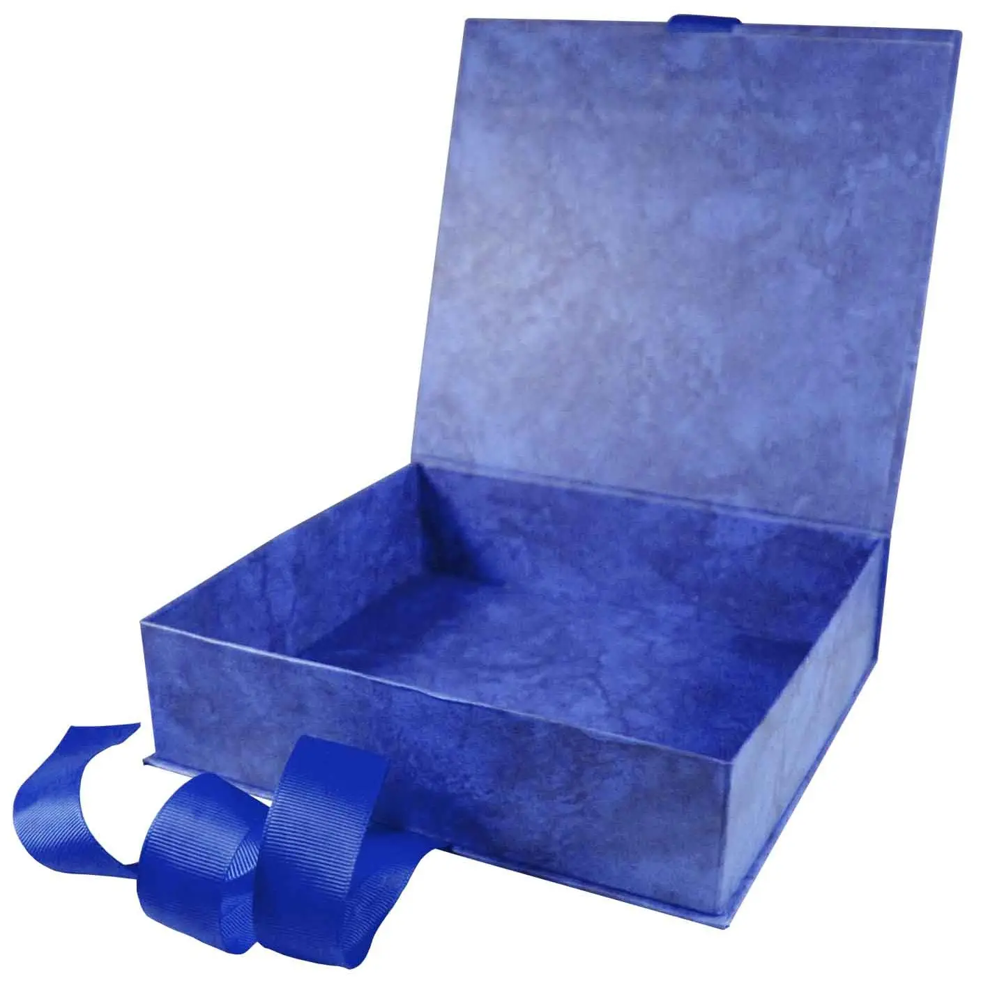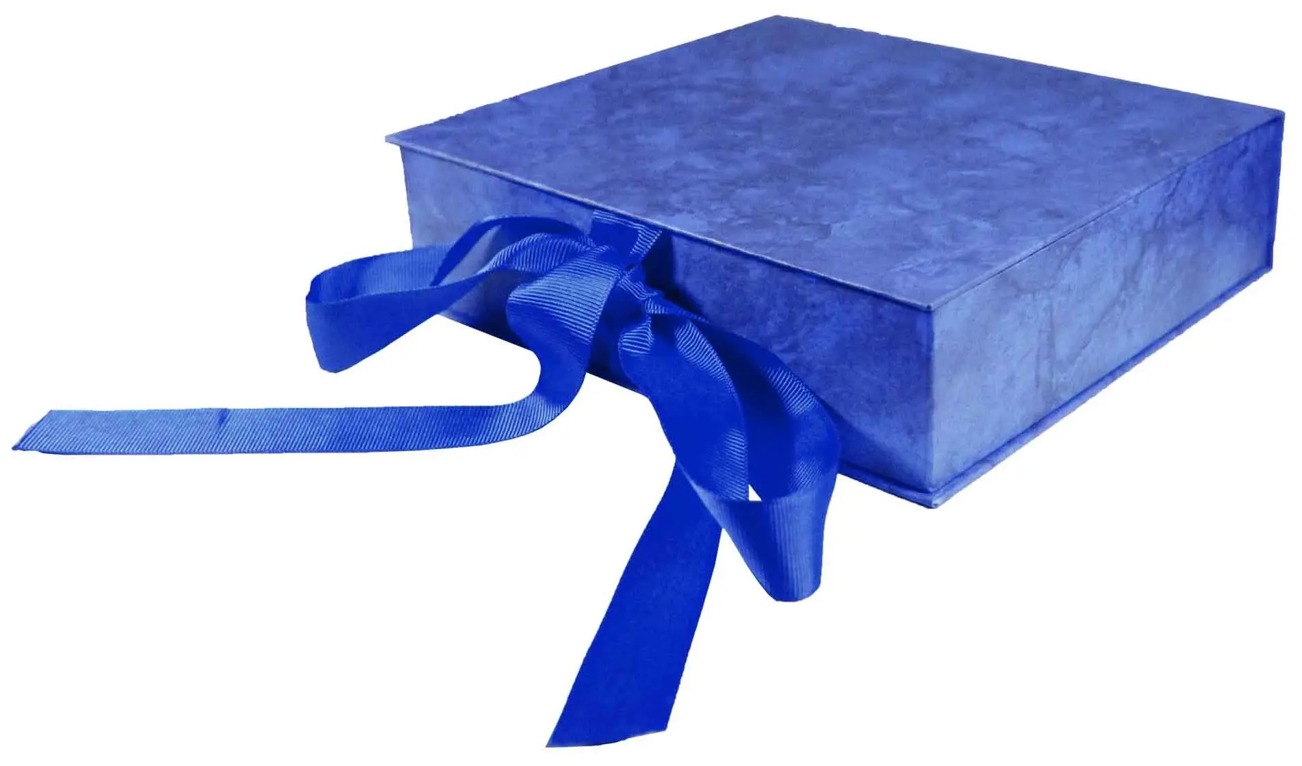 Коробка для подарков представительского уровня. Качественная и красивая. Выполнена из переплетного картона, кашированного переплетной бумагой "Гроза" синего цвета и дополнена атласной лентой в цвет коробки. Размер коробки 200*180*50 мм