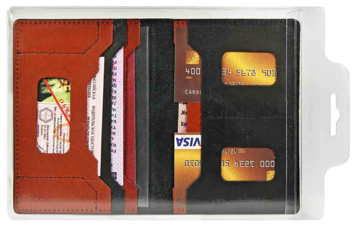 Обложка для автодокументов. Выполнена из натуральной кожи. Обложка для автодокументов адаптирована под российские реалии и включает в числе прочих, прорезные карманы для пластиковых карт, в том числе для автодокументов, файл пвх для паспорта. Упаковка - пакет из ПВХ (0,13 мм), с европодвесом.