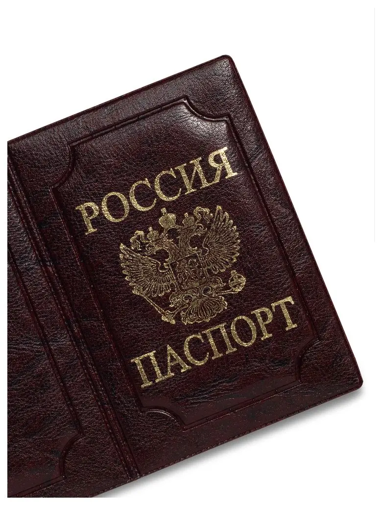 Обложка для паспорта вертикальная из искусственной кожи, выполнена в красном цвете. На лицевой стороне методом тиснения золотой фольгой нанесено изобраение герба Российской Федерации и надпись "РОССИЯ" и "ПАСПОРТ".