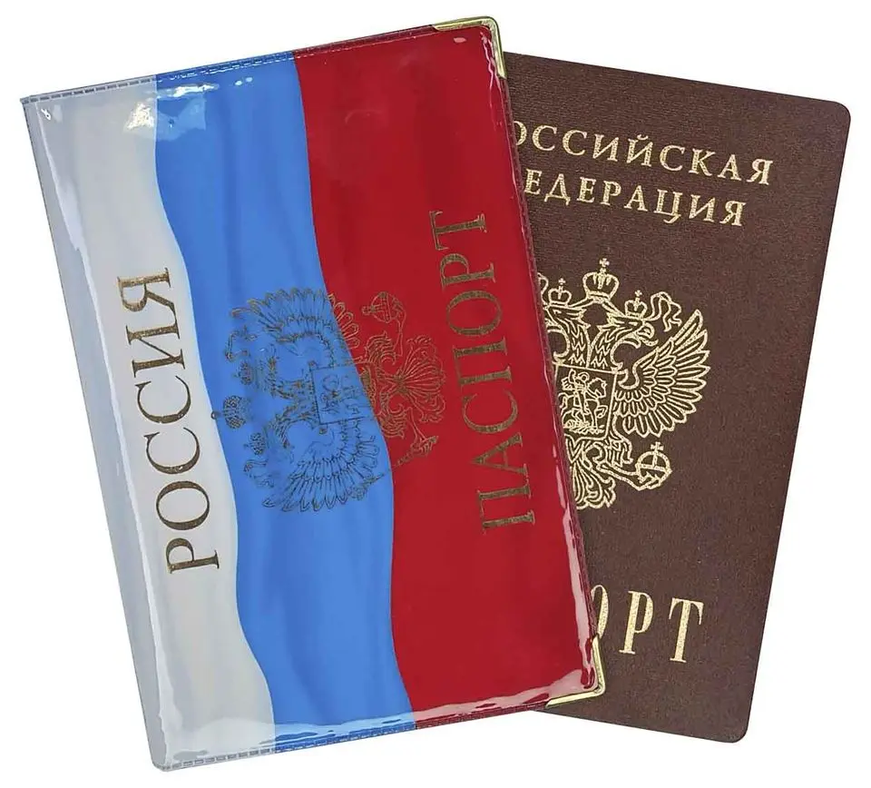 Горизонтальная глянцевая обложка для паспорта с двумя металлическими уголками. На лицевой стороне методом тиснения золотой фольгой нанесено изображение герба Российской Федерации и надпись "РОССИЯ" и "ПАСПОРТ".