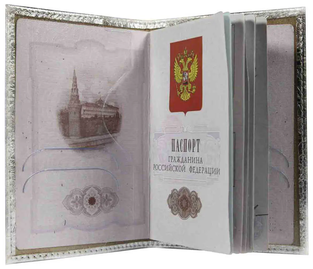Обложка для паспорта из натуральной кожи, металлик серебрянный, тисн.блинтовое"РОССИЯ-ПАСПОРТ-ГЕРБ"