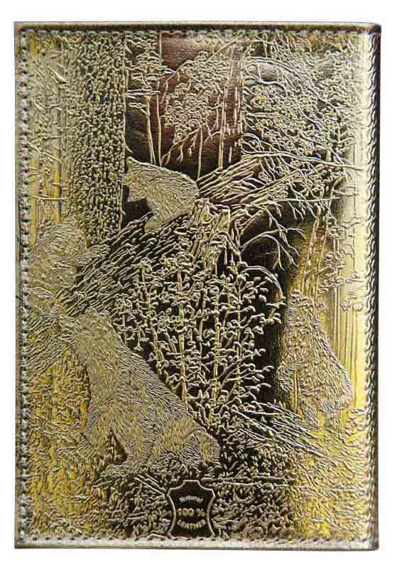 Обложка для паспорта из натуральной кожи, золотой, сплошное тиснение фольгой "металлик" по коже "Медведь 3D"