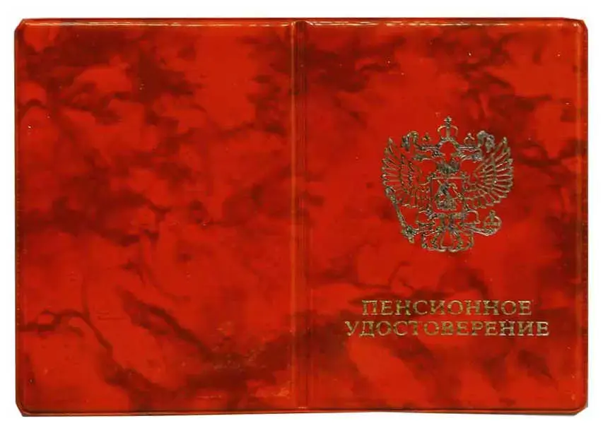 - Надпись (текст и рисунок): РОССИЯ, ПЕНСИОННОЕ УДОСТОВЕРЕНИЕ, Герб (Золотое тиснение)