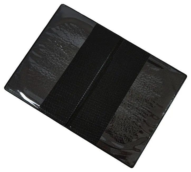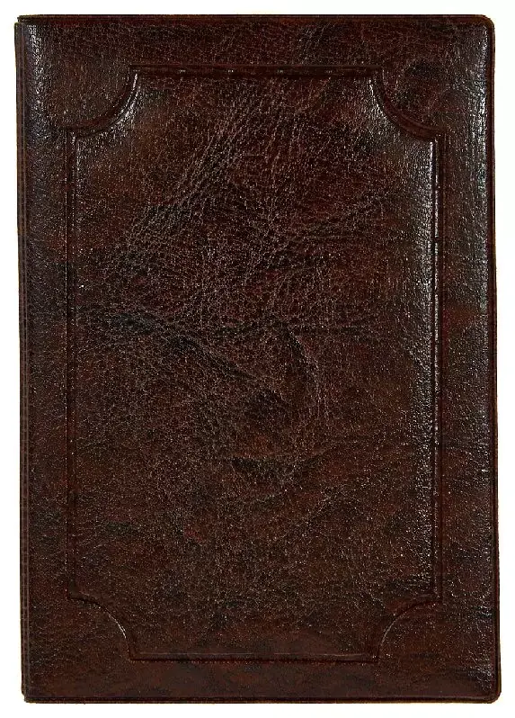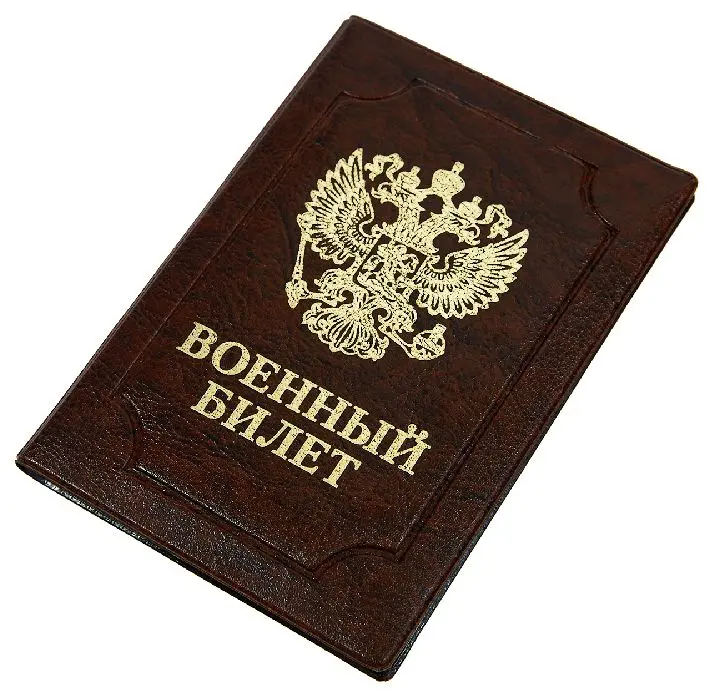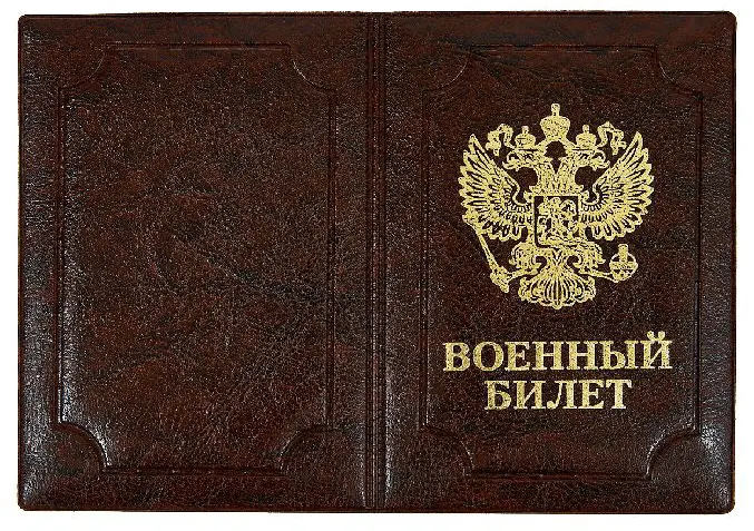 Обложка для военного билета из искусственной кожи, выполнена в коричневом цвете. На лицевой стороне методом тиснения золотой фольгой нанесено изображение герба Российской Федерации и надпись "ВОЕННЫЙ БИЛЕТ".