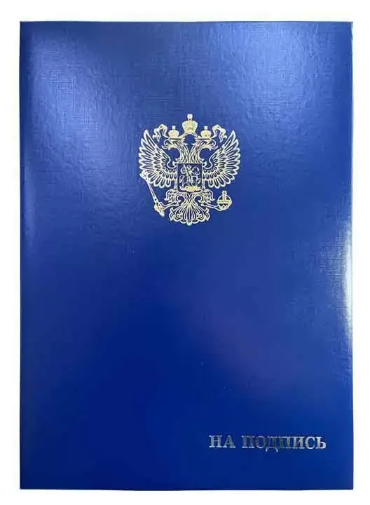 Папка адресная бумвинил А4 (пухлая) "На подпись + Герб" синяя с ляссе