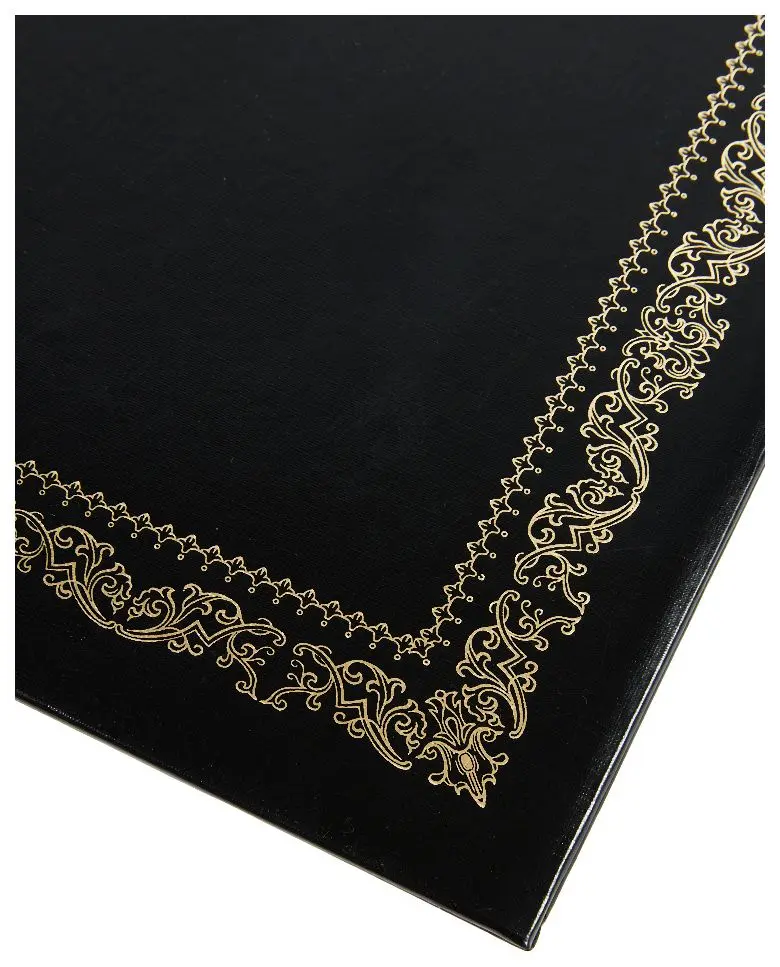Адресная папка мягкая формата А4 изготовлена из бумвинила черного цвета. Внутренние вклейки — белая офсетная бумага. На обложку методом тиснения золотой фольгой нанесена рамка. Адресная папка подходит для поздравлений, хранения документов, а также подачиих на подпись.